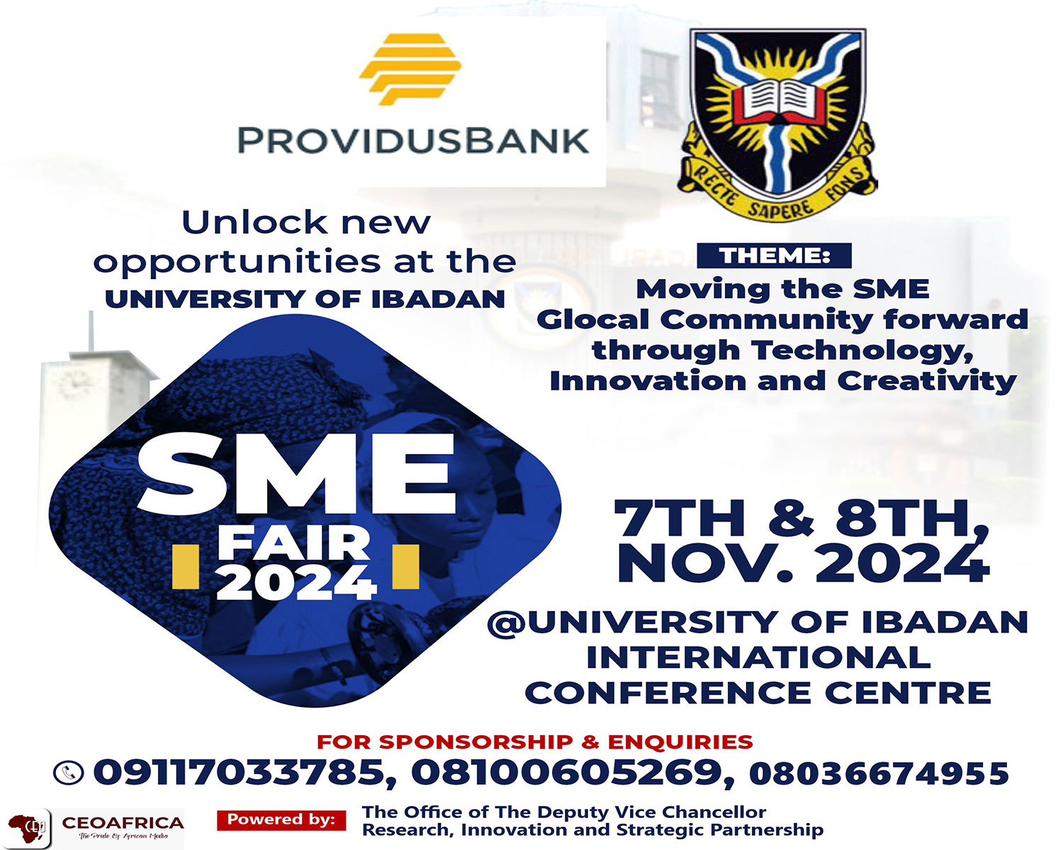 The University of Ibadan is delighted to present the 2024 SME Fair; A premier event dedicated to promoting innovation, entrepreneurship, and business growth in our community. This fair brings together small and medium enterprises (SMEs), industry experts, investors, and government agencies to foster collaboration, knowledge sharing, and business opportunities.